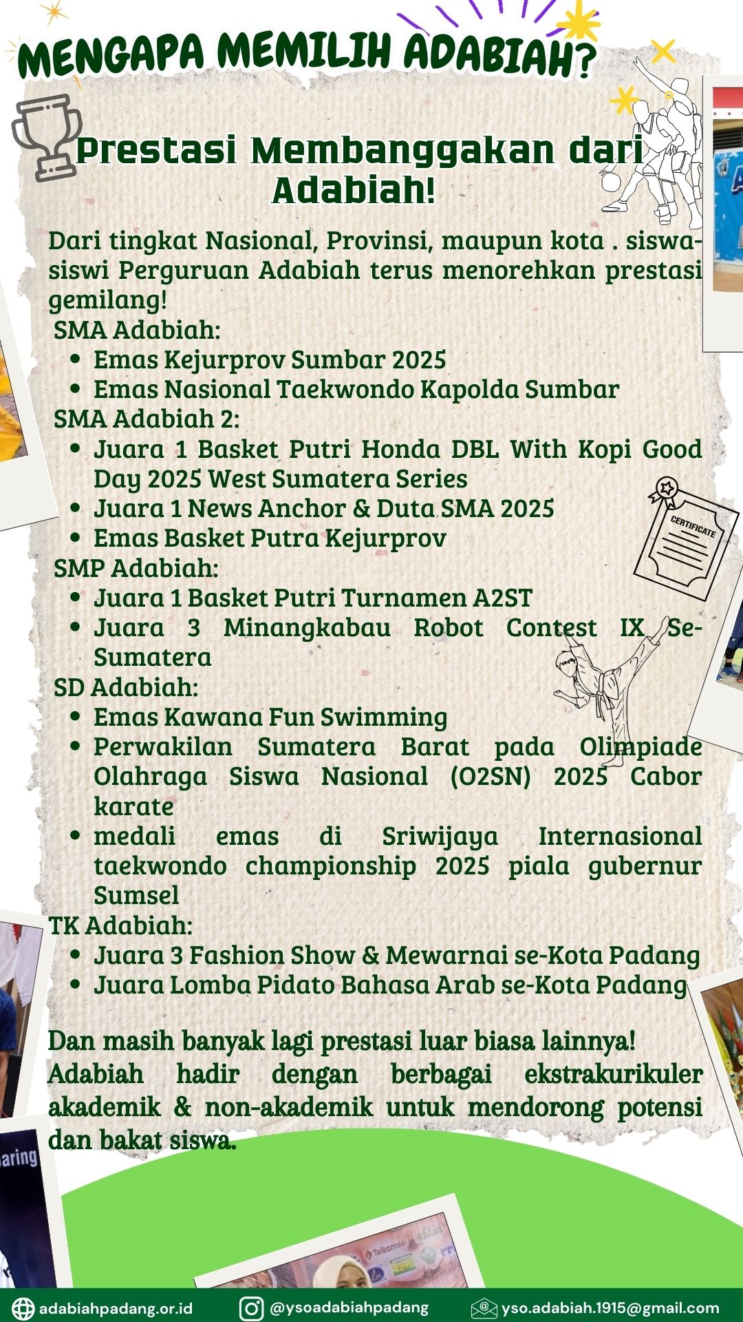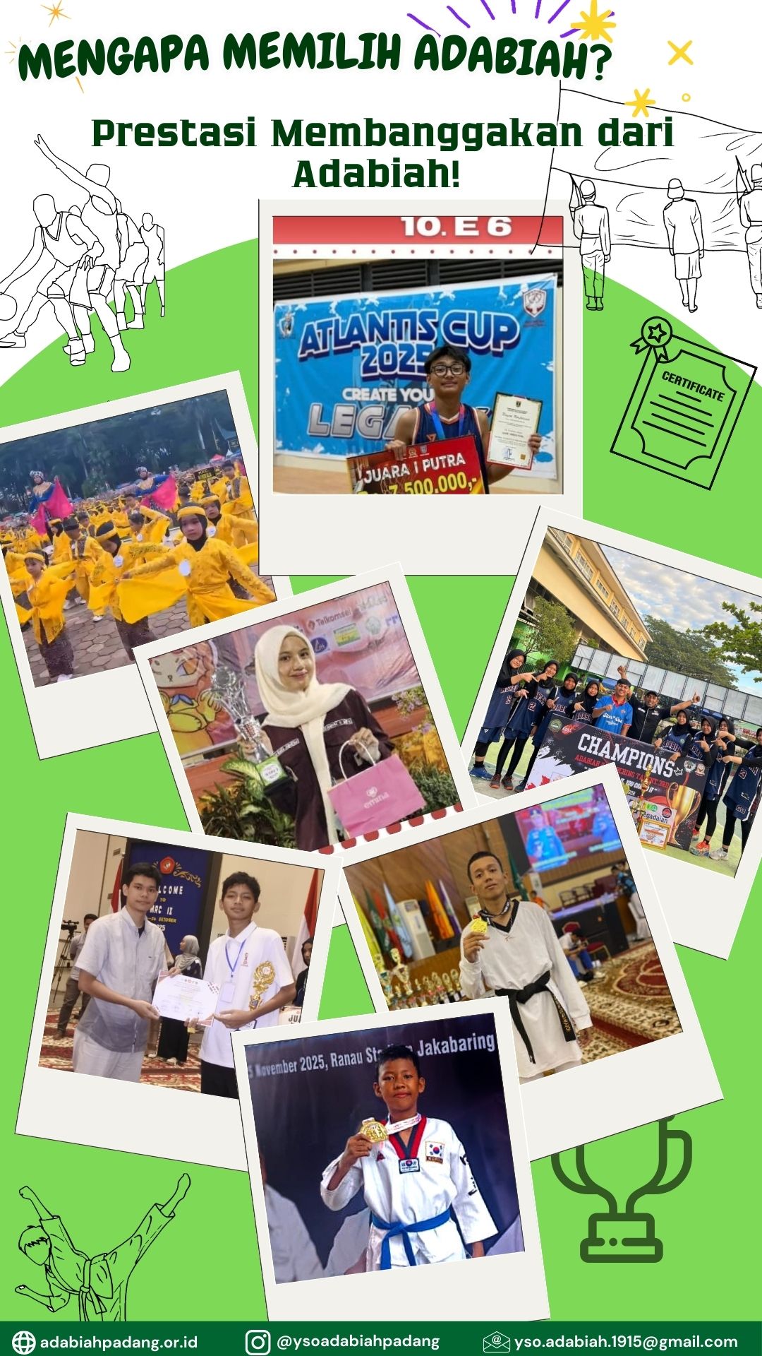 Dari tingkat kota, provinsi, nasional hingga internasional—siswa-siswi Adabiah terus menorehkan prestasi di bidang akademik, olahraga, seni, dan teknologi.